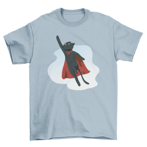 Super Hero Cat T-Shirt Design featuring an illustration of a black cat flying wearing a red cape.
